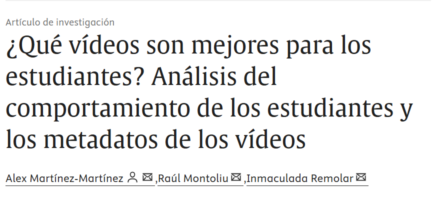 Este reciente artículo, publicado en colaboración entre los grupos IA3 y dentro del proyecto eDiploma, explora el impacto de los videos educativos en el aprendizaje, con el objetivo de identificar cuáles resultan más efectivos para los estudiantes. La investigación, realizada por Alex Martínez-Martínez, Raúl Montoliu e Inmaculada Remolar, examina el comportamiento de los estudiantes y los metadatos de video en la plataforma XuetangX, MOOC-CubeX.